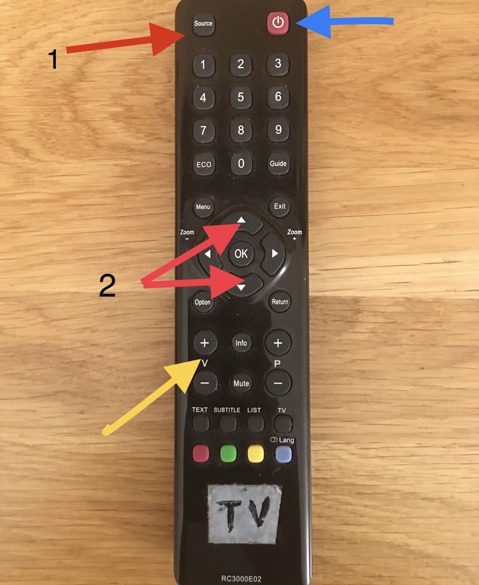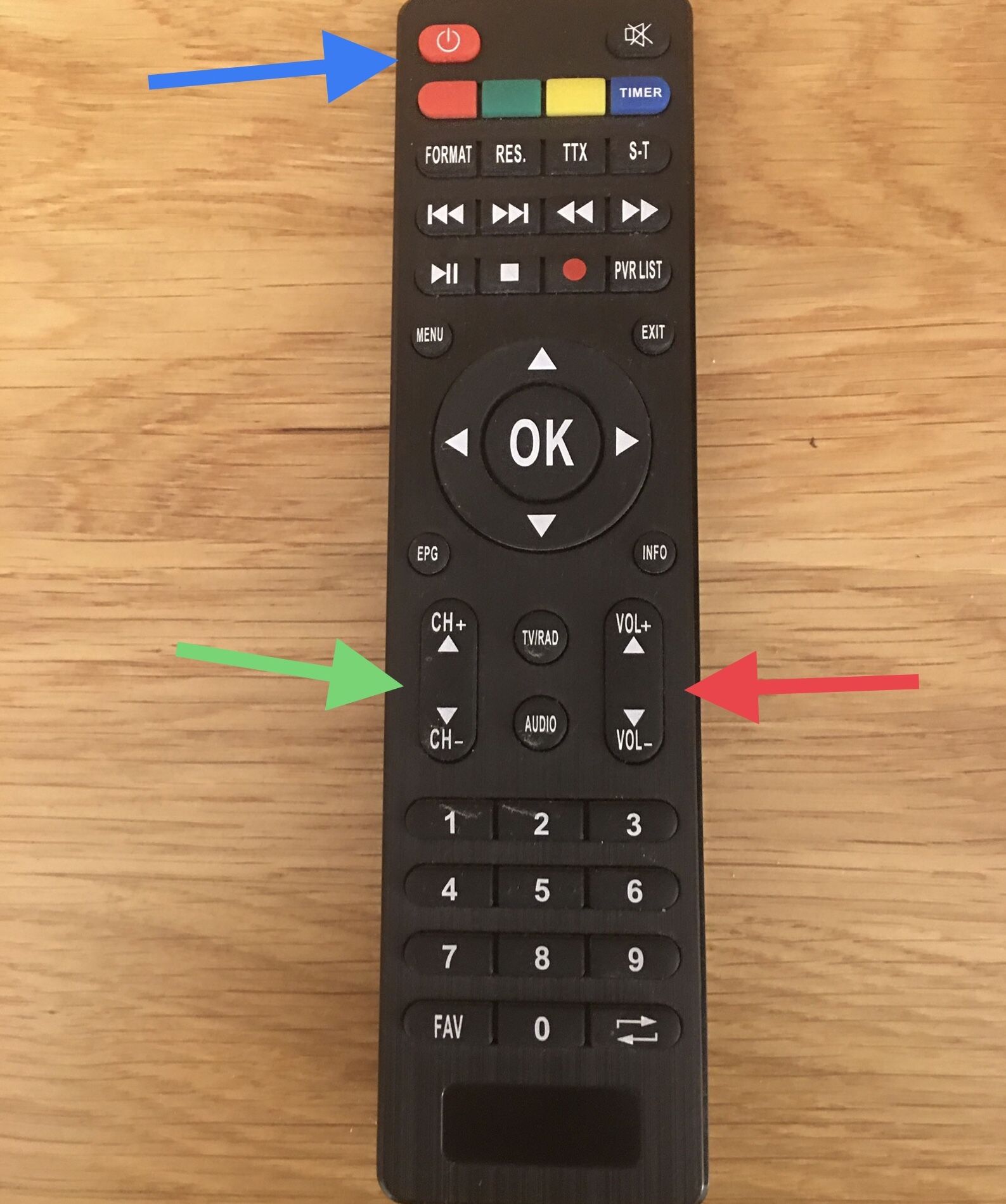 Il y a 2 télécommandes, une pour la TV elle-même et une autre pour le décodeur. Sur la télécommande de la TV appuyez sur le bouton On/Off (flèche bleue sur la 1ère photo), le voyant rouge de la TV situé en bas à droite de l'écran va s'éteindre (3ème photo, flèche rouge). Sur la télécommande du décodeur (2 ème photo) appuyez sur le bouton On/Off (flèche bleue). Après plusieurs secondes (40 secondes au moins) apparait alors le message TNTSAT sur la tv (photo 4). Sur la télécommande du décodeur (photo 2) apuyez ensuite sur les boutons CH+ ET CH- (flèche verte) pour changer de chaines et VOL+ ET VOL - (flèche rouge) pour augmenter ou baisser le volume.