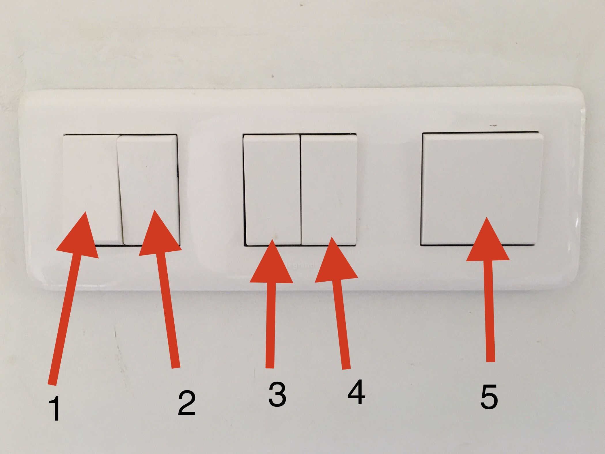 Ils sont situés au dessus du miroir, on ne les voit quasiment pas. Il y a 1 blocs de prises/interrupteur à chaque extrémités de la tête de lit et au centre un interrupteur isolé qui allume un éclairage d'ambiance extérieur en face de la fenêtre de la chambre (visible uniquement la nuit). Sur les blocs à chaque extrémité vous trouverez un interrupteur qui commande la prise qui se trouve à gauche pour l'interrupteur du bloc droite et la prise de droite pour l'interrupeur du bloc gauche, tout cela parait compliqué ... et ça l'est un peu quand même mais on prend vite l'habitude. L'interrupteur qui commande la prise sert à éteindre une lampe qui serait dépourvue d'interrupteur mais comme ce n'est pas le cas cet interrupteur ne sert à rien