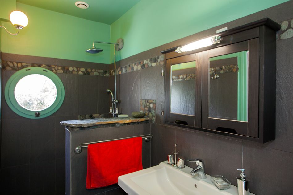 Pourquoi Ecolo-gîte ? Construit en bois (2009), l'eau de pluie est récupérée pour l'arrosage. La décoration a, en partie, été réalisée avec des materiaux de la région (galets de negru, lauzes de pays ...). Equipé de la climatisation (pompe à chaleur), l'eau obtenue par condensation est canalisée et permet l'arrosage d'un arbre.