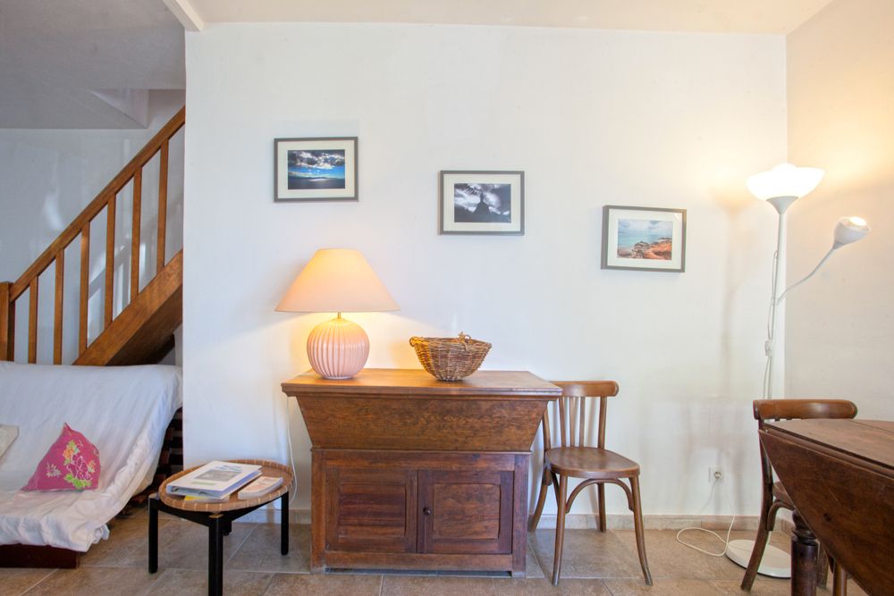 Au rez-de-chaussée se trouvent la cuisine et un grand séjour équipé d'un convertible (Clic-Clac) et d'une cheminée. Ces pièces restent fraiches même en été.